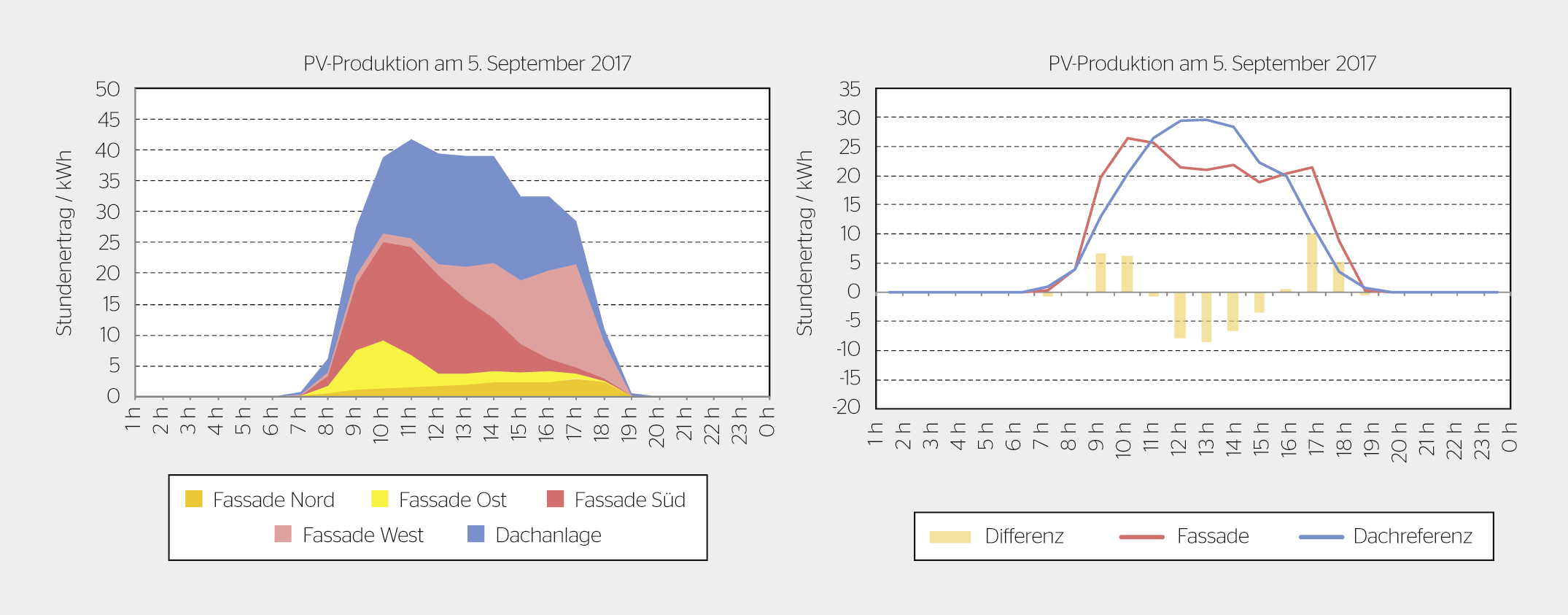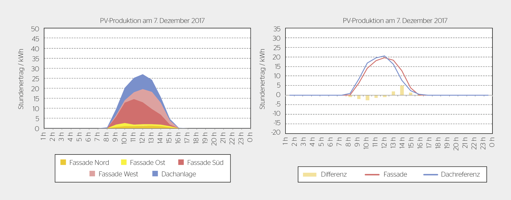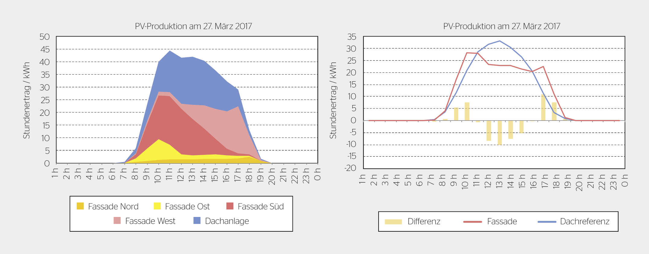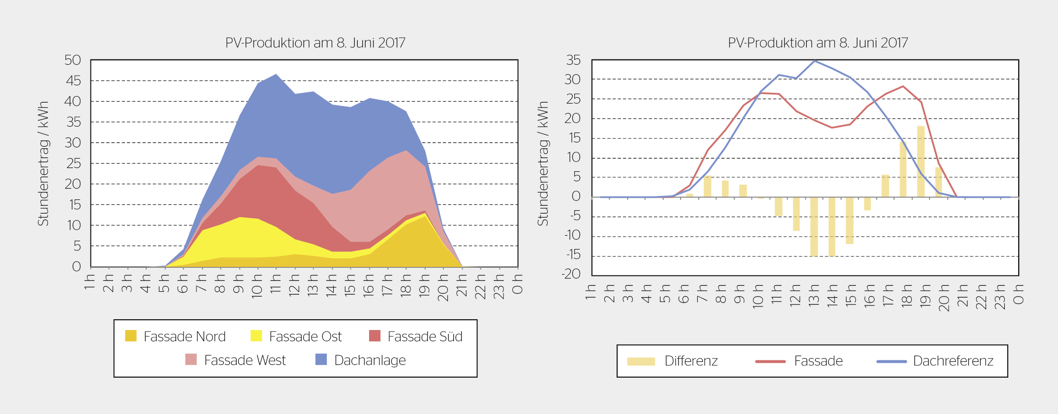 Auch in den Tagesprofilen (untenstehende Slide-Show) ist grafisch gut erkennbar, dass die Fassadenanlage im Tagesverlauf einen gleichmässigen Ertrag bereitstellt. In den Grafiken rechts wird wiederum die Fassadenanlage mit einer ertragsgleichen Dachanlage verglichen.