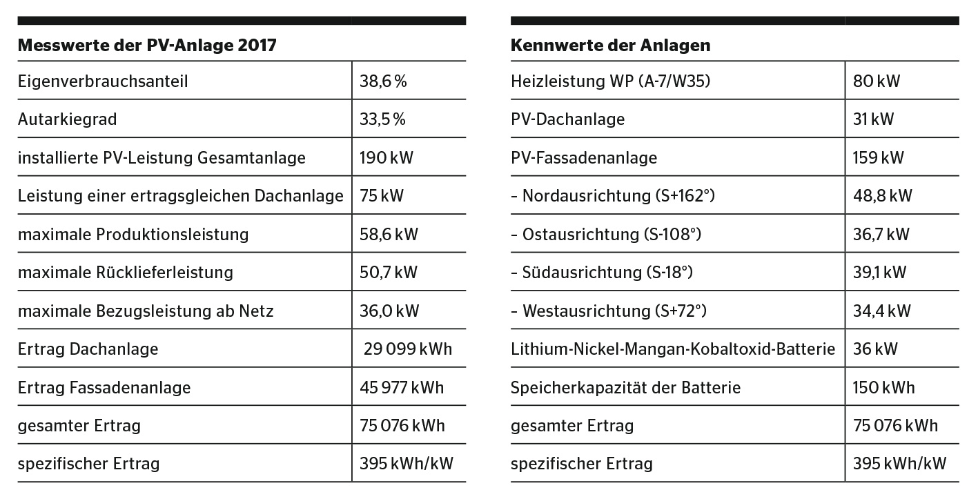 Der spezifische Ertrag der Photovoltaik-Fassadenanlage liegt erwartungsgemäss tiefer als bei einer entsprechenden ertragsgleichen Dachanlage. Dies, weil insbesondere die Anlagenteile an der Nordfassade vergleichsweise wenig Sonnenlicht, dafür konzentriert auf die Abendstunden, erhalten und weil im städtischen Umfeld Fassadenanteile immer wieder beschattet sind. Jedoch konnten bereits ohne Batterie ein hoher Eigenverbrauchsanteil und Autarkiegrad erreicht werden. Diese überdurchschnittlichen Werte für eine Anlage dieser Grösse sind auf die Neigung und Ausrichtung der Fassadenanlage in vier Himmelsrichtungen sowie die Regelung der Wärmepumpen zurückzuführen.
