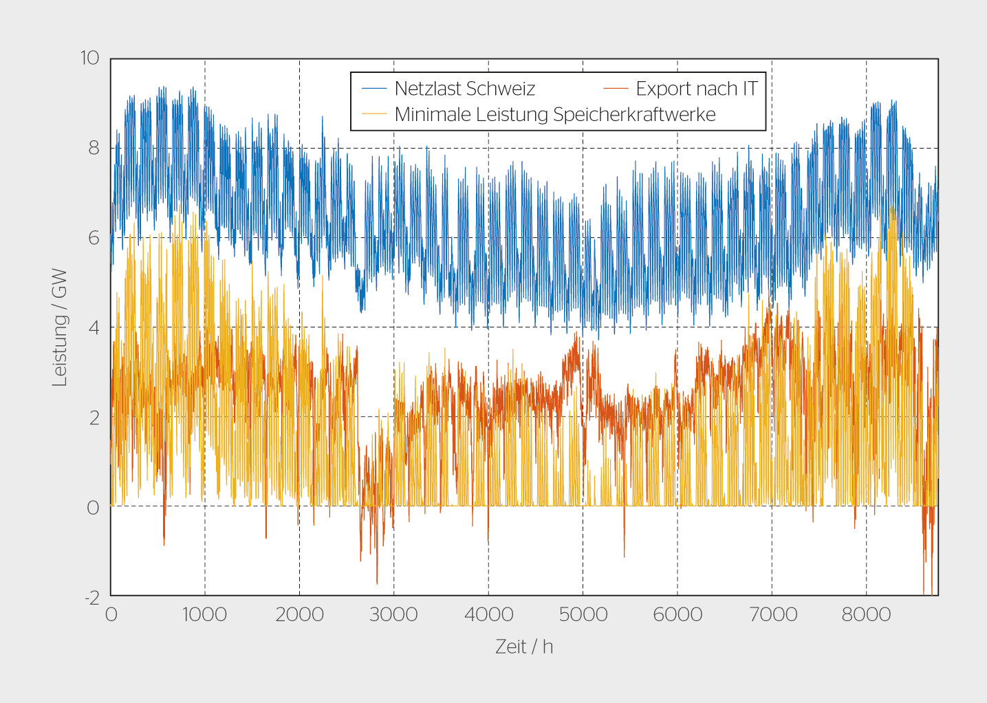 Die Kennzahlen der Wasserkraftwerke wie Leistung, Speicherkapazität und Zuflüsse entsprechen der Schweizer Elektrizitätsstatistik. Die fixen Einspeisungen durch Atom- und Laufwasserkraftwerke werden in verschiedenen Szenarien untersucht. Im ersten Schritt der Analyse wird die Schweizer Netzlast und der Export Richtung Italien systematisch variiert. Die Produktion durch Photovoltaik und andere verteilte Erzeugungsanlagen wird dabei als Teil der Nettolast modelliert. Um den jeweils minimalen Produktionsbedarf durch Speicherkraftwerke zu bestimmen, versucht die Optimierung zunächst den über die fixe Erzeugung hinausgehenden Energiebedarf durch Importe aus dem Norden zu decken. Nur wenn das nicht möglich ist, werden die flexiblen Wasserkraftwerke eingesetzt.