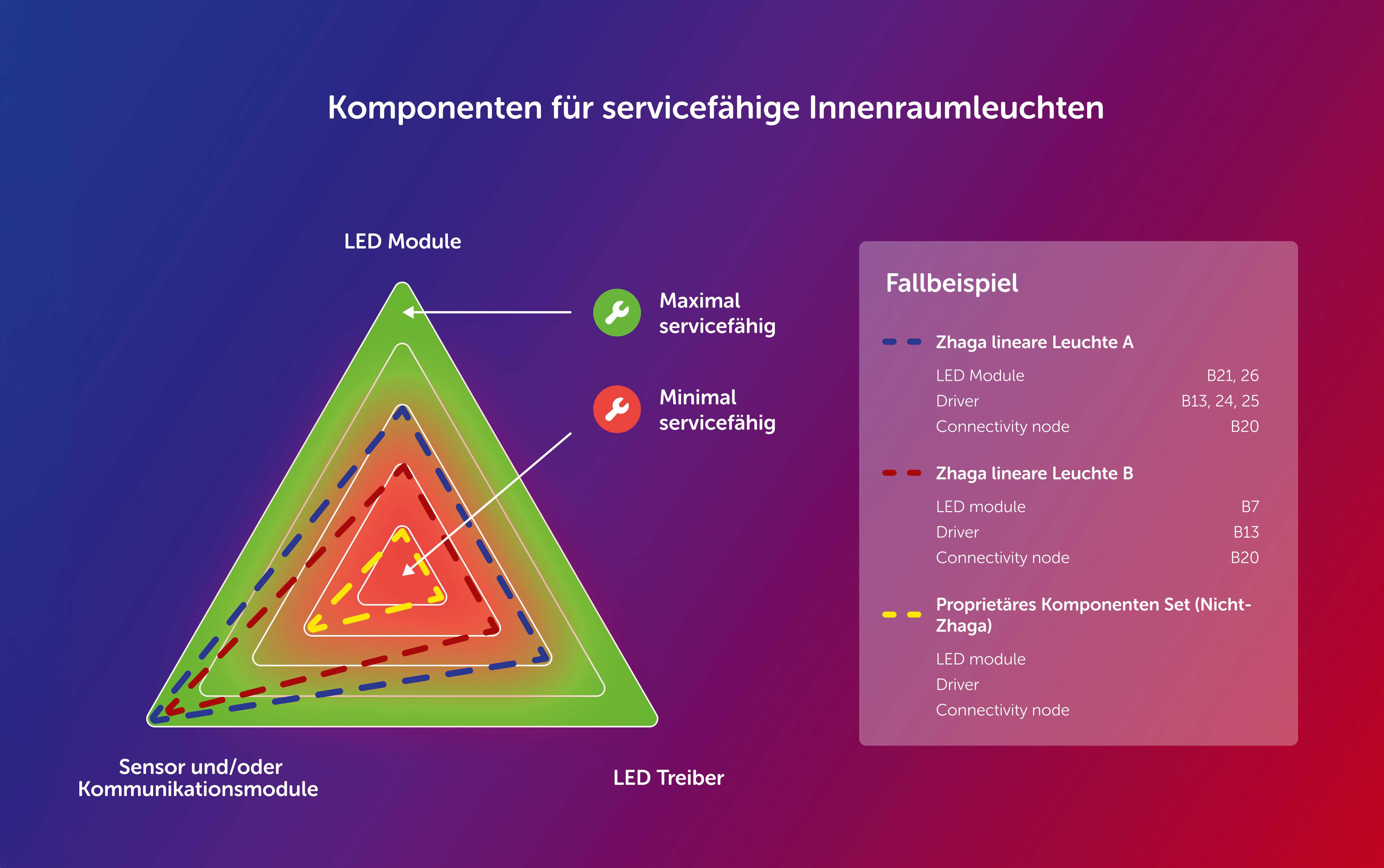 Das Diagramm zeigt, wie verschiedene Zhaga-Bücher zur Wartungsfähigkeit von LED-Treibern, Modulen und Sensor- bzw. Kommunikationsmodulen beitragen. Das Innere der Grafik weist auf eine minimale Servicefähigkeit hin, während sich das Äussere auf eine maximale Servicefähigkeit bezieht. Minimale Servicefähigkeit bedeutet, dass das Bauteil austauschbar ist und nur das. Maximale Servicefähigkeit hingegen bedeutet, dass die Komponente austauschbar ist, auf einem globalen Standard basiert, Plug-and-Play-fähig ist, einen Sockel hat und im Falle eines Treibers mit NFC programmierbar ist.