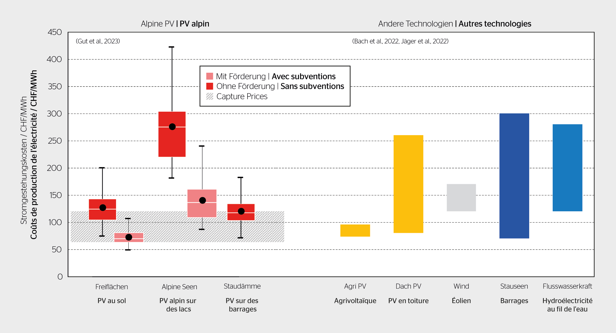 Mit diesen Investitionskosten liegen die Gestehungskosten von alpinen Freiflächenanlagen zwischen 110 und 140 CHF/MWh, je nach Sonneneinstrahlung [11]. Im Vergleich zu Solaranlagen auf Dächern, in dualer Nutzung in der Landwirtschaft (Agri PV) und auf Stauseen, aber auch Wasserkraftanlagen weisen alpine Freiflächenanlagen damit oft geringere Gestehungskosten auf – vergleichbar ist hier nur die Windkraft. Damit Investitionen in alpine PV profitabel sein können, müssen die Gestehungskosten unter dem erwarteten Verkaufspreis des erzeugten Stroms liegen. Die meisten Szenarien zeigen durchschnittliche Strommarktpreise zwischen 50 und 100 CHF/MWh bis 2050, in Ausnahmefällen bis zu 200 CHF/MWh [12]. Da die Strompreise über die Zeit stark variieren können, ist für die Stromerzeuger der sogenannte «Capture Price» relevant, der durchschnittlich zu erwartende Strompreis in den Stunden der Stromerzeugung. So haben alpine PV-Anlagen wegen des höheren Winterstromanteils einen deutlich höheren erwarteten Capture Price als beispielsweise Dach-PV im Mittelland. Mit den Subventionen (maximal 60% der Investitionskosten) kommen die Gestehungskosten in den Bereich dieser Capture Prices (siehe Grafik oben).