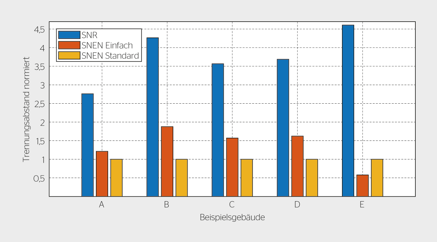 Zusammenfassend lässt sich sagen, dass der Trennungsabstand nach SNR der fünfzehn Beispiele nur bei einem Beispiel (Beispiel A, 5 m, Beton) kürzer ist als die Abstände, welche die SN-EN fordert. Man sieht zudem, dass der Standardansatz der SN-EN meist kürzere Trennungsabstände als der vereinfachte Ansatz ergibt. In einigen Fällen kann der vereinfachte Ansatz zwar kürzere Abstände liefern, allerdings gibt es in der SN-EN-Norm einige Limitierungen für diese Fälle, beispielsweise, dass beim vereinfachten Ansatz die Gebäudehöhe nicht kleiner als ein Viertel der maximalen Gebäudebreite sein darf oder dass nicht mehr als drei Ableiter für die Berechnung des Trennungsabstandes berücksichtigt werden.