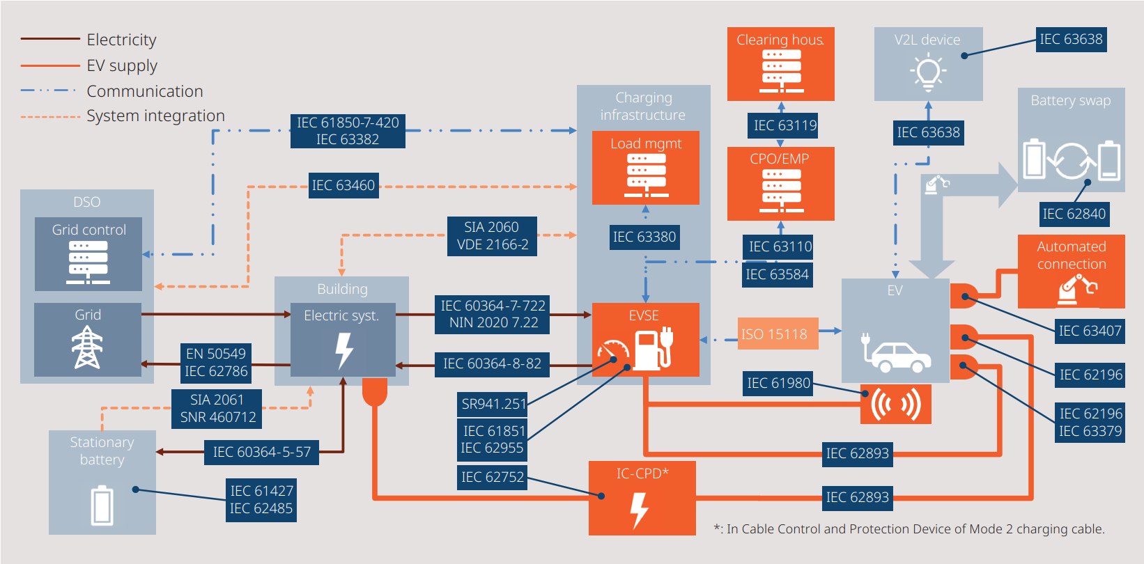 La série de normes ISO 15118 comprend plusieurs parties qui, réunies, définissent l’ensemble de la communication de haut niveau entre les véhicules et les bornes de recharge, y compris les protocoles, les mécanismes de sécurité et les formats de messages. Certains aspects sont déjà utilisés aujourd’hui dans les bornes de recharge DC équipées de connecteurs CCS. Même sans obligation directe, la Suisse peut tirer profit de cette série de normes: à l’avenir, les véhicules et les bornes de recharge «parleront de plus en plus la même langue». La norme ISO 15118-20 marque ainsi le passage de solutions isolées à une infrastructure de recharge intégrée de manière systémique, qui met l’accent sur l’interopérabilité.